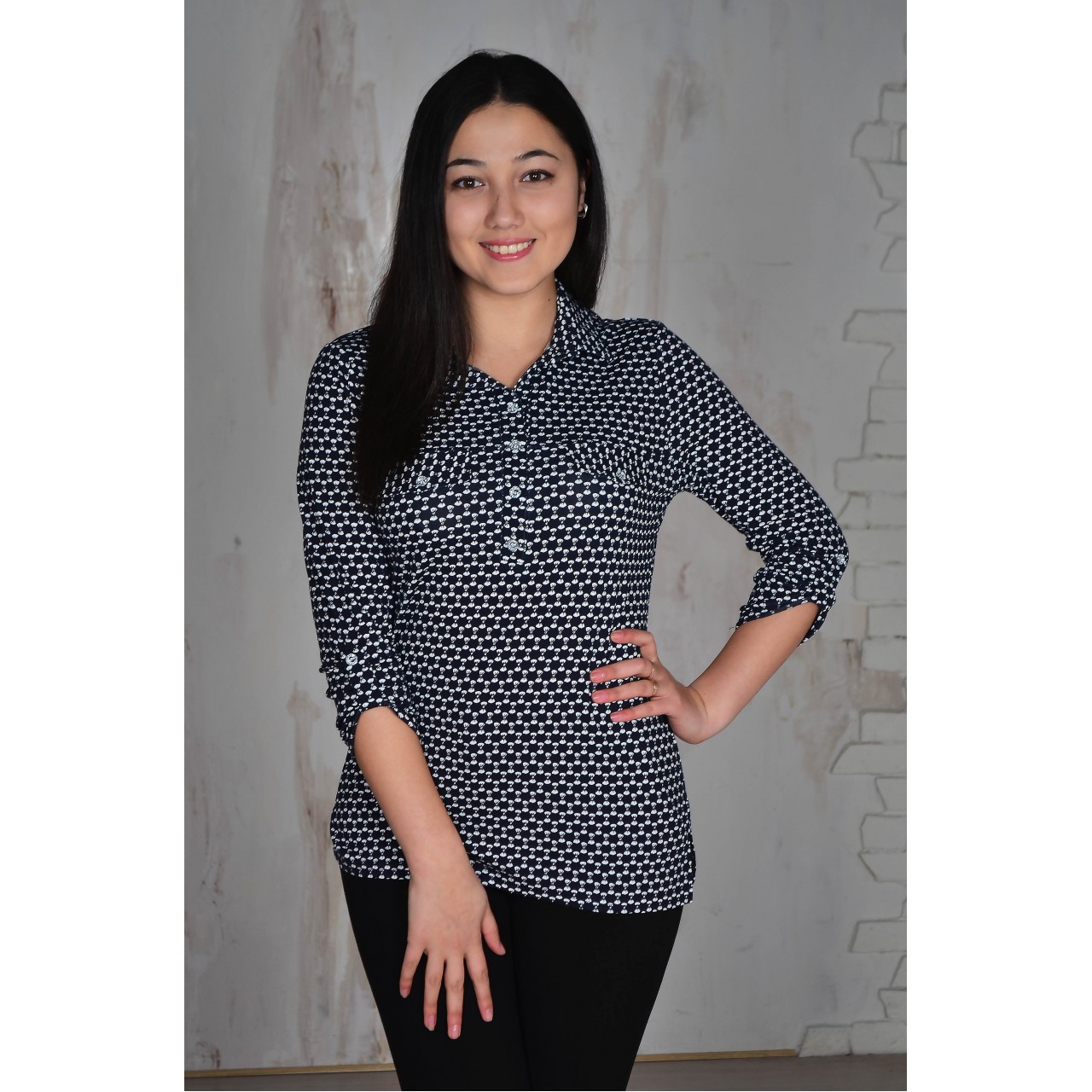 Женская блуза выполнена из викозы. Рукав длиной три четверти, с патами. Пуговицы на переде не рабочие - имитируют застежку рубашки. На боковых швах разрезы Воротник отложной.